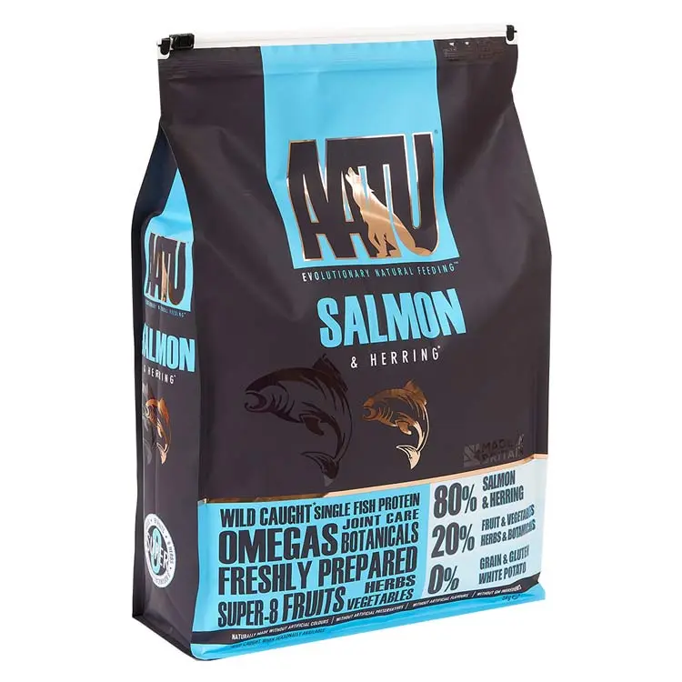 Salmon (51%), Dehydrated Herring (29%), Sweet Potato, Chickpeas, Peas, Lucerne, Salmon Stock, Carrots, Tomato, Chicory, Tapioca, Apple, Pear, Cranberry, Blueberry, Mulberry, Orange, Bilberry, Cowberry, Parsley, Peppermint, Spirulina, Seaweed, Oregano, Sage, Marjoram, Thyme, Chamomile, Rosehip, Stinging Nettle, Yucca, Marigold, Aniseed, Fenugreek, Cinnamon, Hip & Joint Care