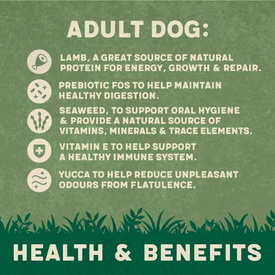 Lamb (26%), Dried Lamb (6.5%), Rice (20%), Maize, Barley, Poultry Fat, Poultry Gravy, Beet Pulp, Linseed, Minerals, Seaweed (0.1%), FOS (0.1%), Yucca Extract (0.01%)
