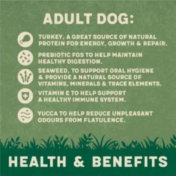 Turkey and Meat Meals (26%), Dried Turkey (6.5%), Rice, Maize, Barley, Peas (4%), Poultry Fat, Poultry Gravy, Beet Pulp, Linseed, Minerals, Seaweed (0.1%), FOS (0.1%), Yucca Extract (0.1%)
