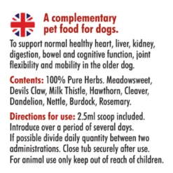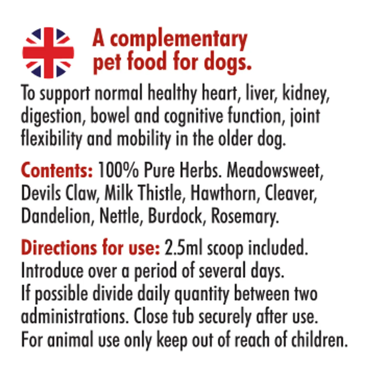 Senior Dog is a fine cut dry supplement containing herbs such as hawthorn, devils claw and milk thistle to provide all round support for the older dog. Its liquid equivalent, Senior Dog Gold, could be used initially due to its quicker absorption (we do not suggest you give both together).