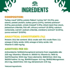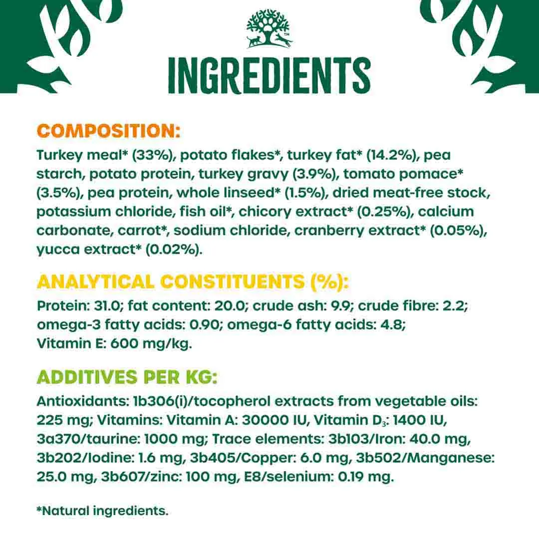 Turkey meal (33%), potato flakes, turkey fat (14.2%), Pea starch, potato protein, turkey gravy (3.9%), tomato pomace (3.5%), pea protein, whole linseed (1.5%), dried meat-free stock, potassium chloride, fish oil, chicory extract (0.25%), calcium carbonate, carrot, sodium chloride, cranberry extract (0.05%), yucca extract (0.02%),