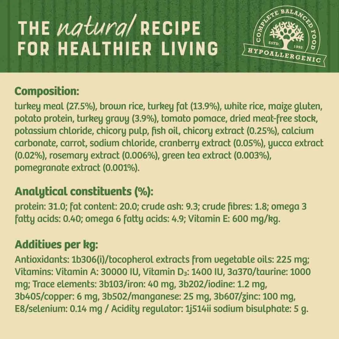 Turkey meal (27.5%), brown rice, turkey fat (13.9%), white rice, maize gluten, potato protein, turkey gravy (3.9%), tomato pomace, dried meat-free stock, potassium chloride, chicory pulp, fish oil, chicory extract (0.25%), calcium carbonate, carrot, sodium chloride, cranberry extract (0.05%), yucca extract (0.02%), rosemary extract (0.01%), green tea extract, pomegranate extract