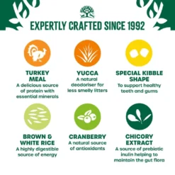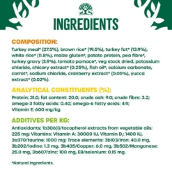 Turkey meal (27.5%), brown rice (19.5%), turkey fat (13.9%), white rice (11.8%), maize gluten, potato protein, pea fibre, turkey gravy (3.9%), tomato pomace, veg stock dried, potassium chloride, chicory extract (0.25%), fish oil, calcium carbonate, carrot, sodium chloride, cranberry extract (0.05%), yucca extract (0.02%)