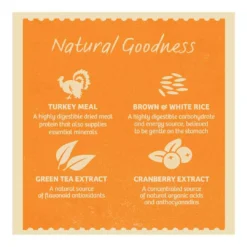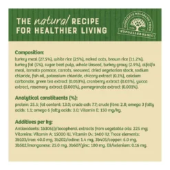 Turkey meal (27.5%), white rice (25%), naked oats, brown rice (11.2%), turkey fat (5%), sugar beet pulp, whole linseed, turkey gravy (2.9%), alfalfa meal, tomato pomace, carrots, seaweed, dried vegetarian stock, sodium chloride, fish oil, potassium chloride, chicory extract (0.1%), calcium carbonate, green tea extract, cranberry extract (0.05%), yucca extract, rosemary extract, pomegranate extract