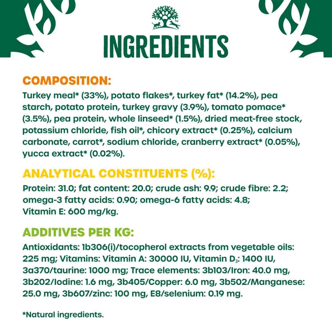 Turkey meal (33%), potato flakes, turkey fat (14.2%), pea starch, potato protein, turkey gravy (3.9%), tomato pomace, pea protein, whole linseed, dried meat-free stock, potassium chloride, fish oil, chicory extract (0.25%), calcium carbonate, carrot, sodium chloride, cranberry extract (0.05%), yucca extract (0.02%), rosemary extract (0.01%), green tea extract, pomegranate extract