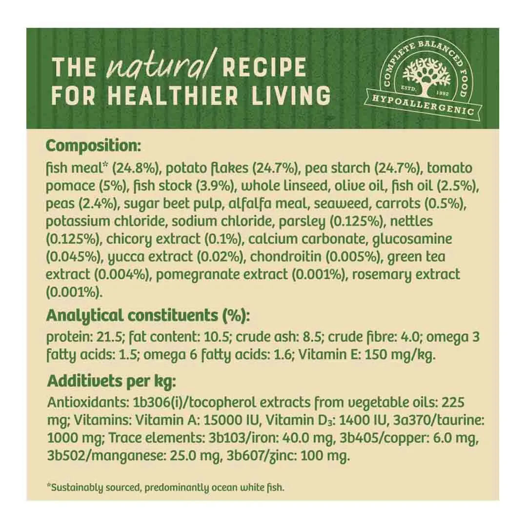 Fish meal (24.8%), potato flakes (24.7%), pea starch (24.7%), tomato pomace (5%), fish stock (3.9%), whole linseed, olive oil, fish oil (2.5%), peas (2.4%), sugar beet pulp, alfalfa meal, seaweed, carrots (0.5%), potassium chloride, sodium chloride, parsley (0.13%), nettles (0.13%), chicory extract (0.1%), calcium carbonate, glucosamine, yucca extract (0.02%), chondroitin, green tea extract, pomegranate extract, rosemary extract
