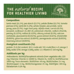 Lamb meal (25.5%), pea starch (23.7%), potato flakes (22.7%), tomato pomace (5%), lamb fat (4.2%), whole linseed, pea protein, lamb gravy (3%), peas (2.5%), sugar beet pulp, alfalfa meal, carrots (0.5%), seaweed, sunflower oil, fish oil, potassium, chloride, sodium chloride, parsley (0.13%), nettles (0.13%), chicory extract (0.1%), calcium carbonate, glucosamine (0.04%), yucca extract, chondroitin, green tea extract, pomegranate extract, rosemary extract