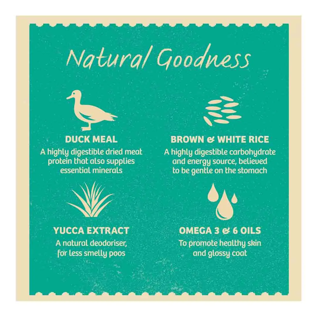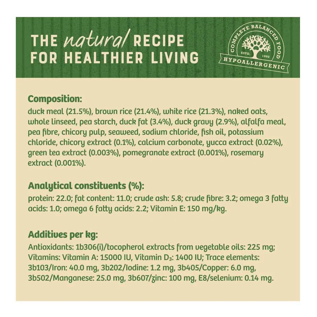 Duck meal (21.5%), brown rice (21.4%), white rice (21.3%), naked oats, whole linseed, pea starch, duck fat (3.4%), duck gravy (2.9%), alfalfa meal, pea fibre, chicory pulp, seaweed, sodium chloride, fish oil, potassium chloride, chicory extract (0.1%), calcium carbonate, yucca extract, green tea extract, pomegranate extract, rosemary extract
