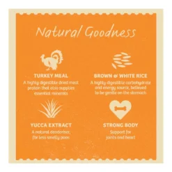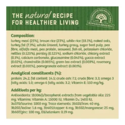 Turkey meal (25%), brown rice (23%), white rice (18.1%), naked oats, turkey fat (7.3%), whole linseed, turkey gravy (2.9%), sugar beet pulp, pea fibre, alfalfa meal, pea protein, seaweed, fish oil, potassium chloride, nettles (0.13%), parsley (0.13%), green tea extract, rosemary extract, pomegranate extract