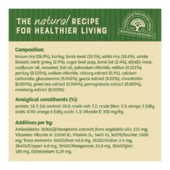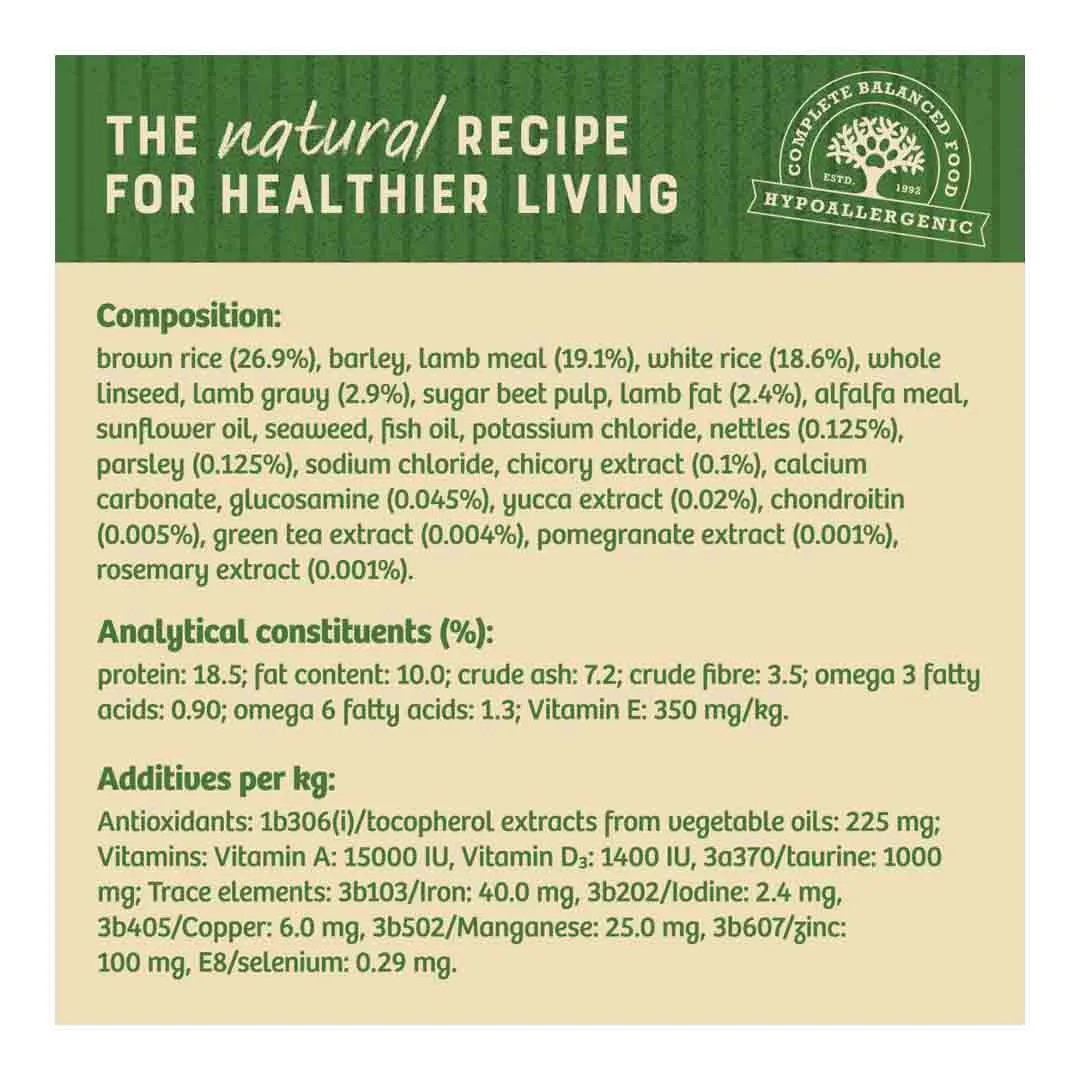 Brown rice (26.9%), barley, lamb meal (19.1%), white rice (18.6%), whole linseed, lamb gravy (2.9%), sugar beet pulp, lamb fat (2.4%), alfalfa meal, sunflower oil, seaweed, fish oil, potassium chloride, nettles (0.13%), parsley (0.13%), sodium chloride, chicory extract (0.1%), calcium carbonate, glucosamine (0.04%), yucca extract (0.02%), chondroitin, green tea extract, pomegranate extract, rosemary extract