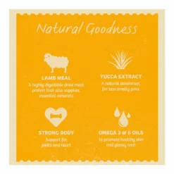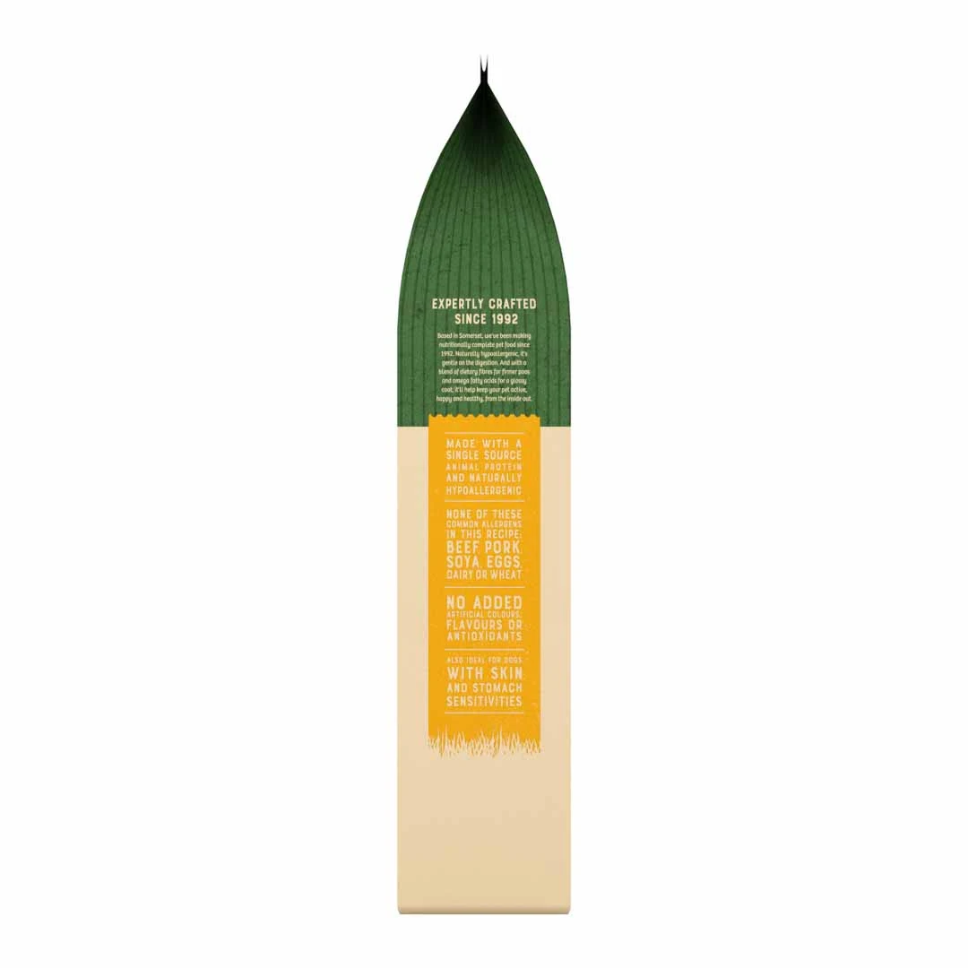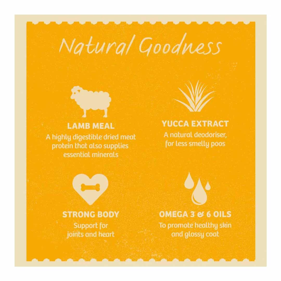Potato Flakes (28.1%), Lamb Meal (23%), Pea Starch (22.6%), Tomato Pomace (5%), Whole Linseed, Lamb Fat (3%), Lamb Gravy (2.9%), Peas (2.5%), Pea Protein, Sugar Beet Pulp, Alfalfa Meal, Omega Oil Supplement, Carrots, Seaweed (0.5%), Pea Fibre, Potassium Chloride, Sodium Chloride, Parsley (0.13%), Nettles (0.13%), Chicory Extract (0.1%), Taurine (0.1%), Calcium Carbonate, Glucosamine, Yucca Extract, Chondroitin
