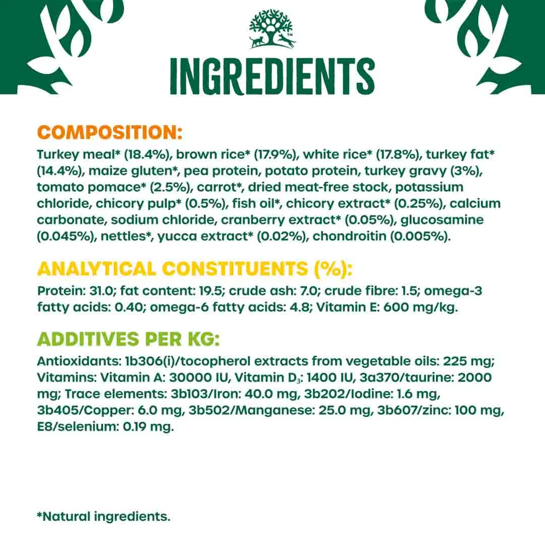 Turkey meal (18.4%), brown rice (17.9%), white rice (17.8%), turkey fat (14.4%), maize gluten, pea protein, potato protein, turkey gravy (3%), tomato pomace (2.5%), carrot, dried meat-free stock, potassium chloride, chicory pulp (0.5%), fish oil, chicory extract (0.25%), calcium carbonate, sodium chloride, cranberry extract (0.05%), glucosamine (0.04%), nettles, yucca extract (0.02%), chondroitin (0.01%)