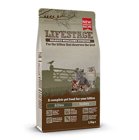 Nutritionally balanced and packed with wholesome ingredients Lifestage Kitten food with Turkey is cooked to perfection from a recipe containing no added wheat, beef, pork or dairy products.