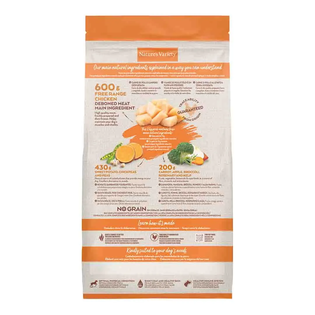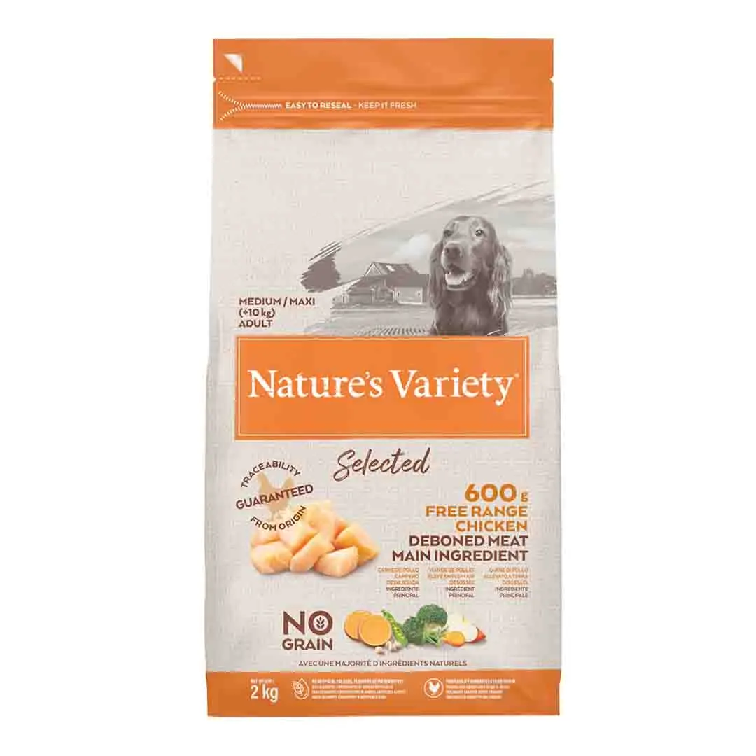 Nature”s Variety Selected for medium and large-size dogs is a complete and balanced dry dog food with a difference. Its high-meat recipe features quality, deboned free range chicken as the main ingredient with a blend of wholesome fruit, vegetables and botanicals.