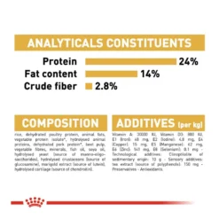 protein (24%), fat (14%), fibre (2.8%), ash (6.4%)