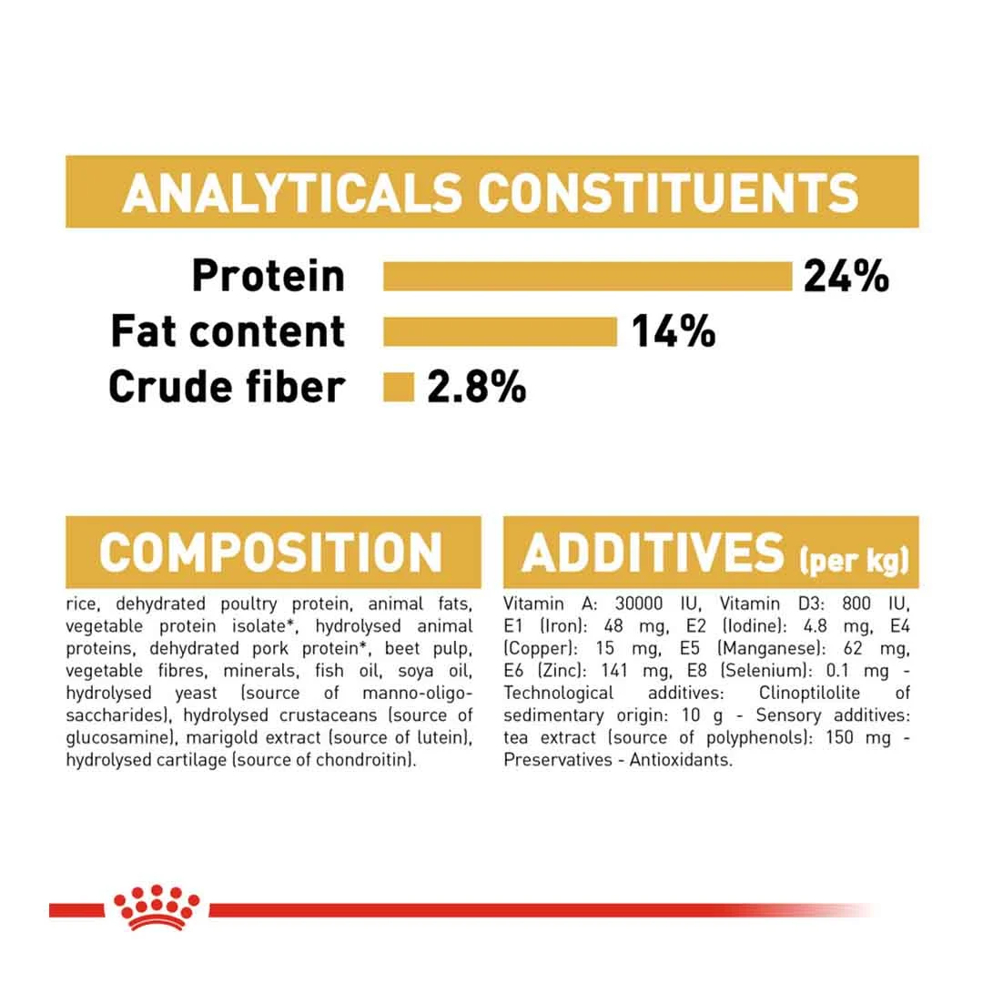 Rice, poultry protein (dried), animal fat, vegetable protein isolate, animal protein (hydrolysed), pork protein (dried), dried sugar beet pulp, lignocellulose, minerals, fish oil, soya oil, yeast hydrolysate (source of mannanoligosaccharides), hydrolysate from crustaceans (source of glucosamine), marigold meal (source of lutein), hydrolysate from cartilage (source of chondroitin)