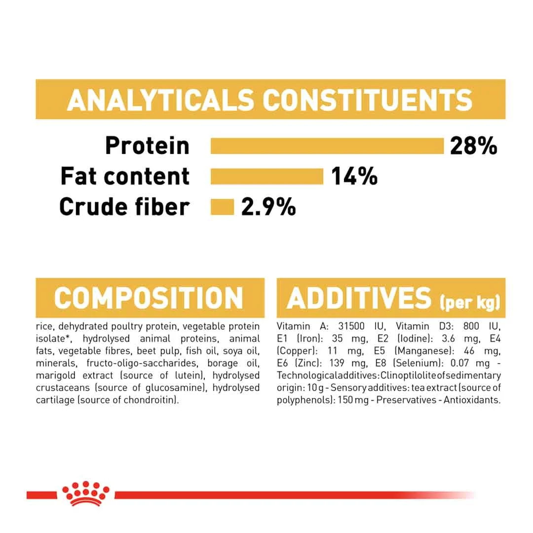 Rice, poultry protein (dried), vegetable protein isolate, animal protein (hydrolysed), animal fat, lignocellulose, dried sugar beet pulp, fish oil, soya oil, minerals, fructooligosaccharides, borage oil, marigold meal (source of lutein), hydrolysate from crustaceans (source of glucosamine), hydrolysate from cartilage (source of chondroitin)