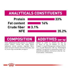 Maize, dehydrated poultry protein, rice, vegetable protein isolate, animal fats, maize gluten, hydrolysed animal proteins, vegetable fibres, yeasts and parts thereof, minerals, beet pulp, soya oil, fructo-oligo-saccharides, borage oil