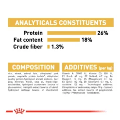 Rice, wheat, animal fats, dehydrated pork protein, vegetable protein isolate, dehydrated poultry protein, hydrolysed animal proteins, beet pulp, minerals, fish oil, soya oil, fructo-oligo-saccharides, hydrolysed crustaceans (source of glucosamine), marigold extract (source of lutein), hydrolysed cartilage (source of chondroitin)