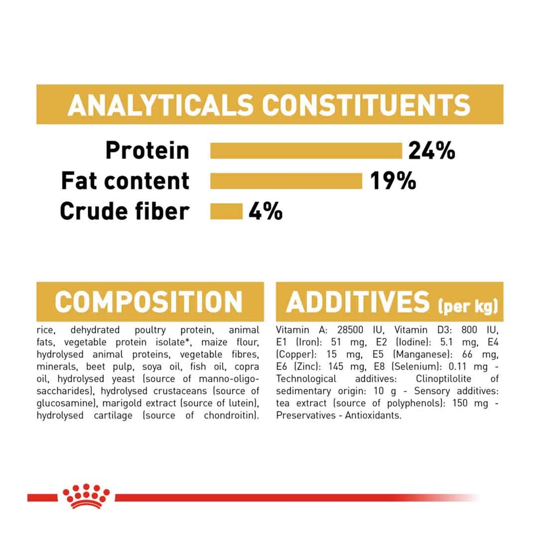 rice, dehydrated poultry protein, animal fats, vegetable protein isolate, maize flour, hydrolysed animal proteins, vegetable fibres, minerals, beet pulp, soya oil, fish oil, copra oil, hydrolysed yeast (source of manno-oligo-saccharides), hydrolysed crustaceans (source of glucosamine), marigold extract (source of lutein), hydrolysed cartilage (source of chondroitin)
