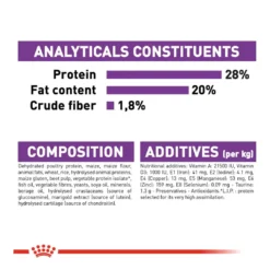 Protein (28%), Fat content (20%), Crude ash (5.3%), Crude fibres (1.8%)