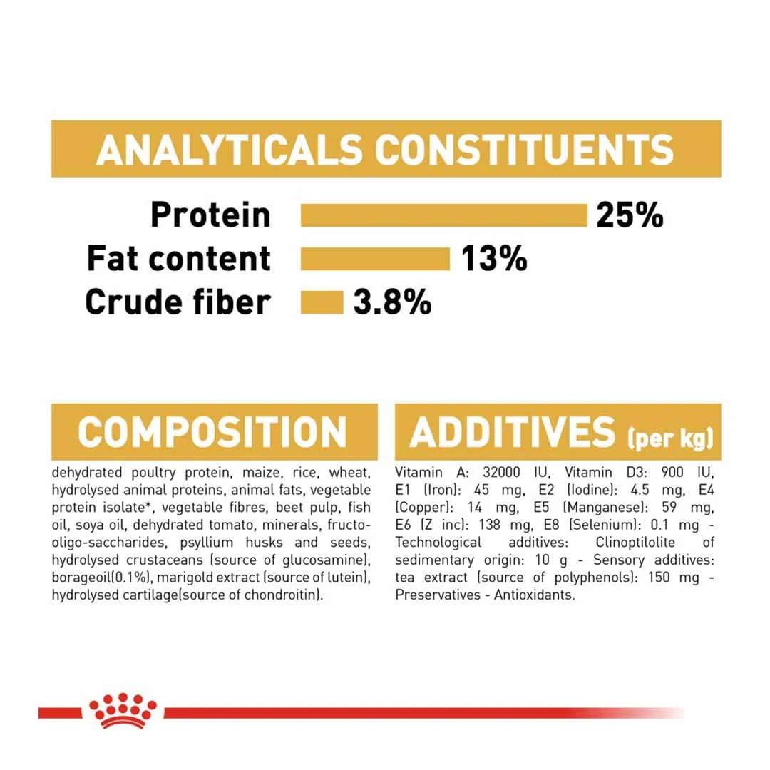 Dehydrated poultry protein, maize, rice, wheat, hydrolysed animal proteins, animal fats, vegetable protein isolate, vegetable fibres, beet pulp, fish oil, soya oil, dehydrated tomato, minerals, fructo-oligo-saccharides, psyllium husks and seeds, hydrolysed crustaceans (source of glucosamine), borage oil (0.1%), marigold extract (source of lutein), hydrolysed cartilage (source of chondroitin)