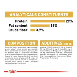 dehydrated poultry protein, rice, maize, vegetable protein isolate, wheat, animal fats, vegetable fibres, hydrolysed animal proteins, beet pulp, fish oil, minerals, soya oil, fructo-oligo-saccharides (0.34%), psyllium husks and seeds, hydrolysed yeast (source of manno-oligo-saccharides), hydrolysed crustaceans (source of glucosamine), borage oil (0.1%), yeasts extracts (source of betaglucans), marigold extract (source of lutein), hydrolysed cartilage (source of chondroitin)