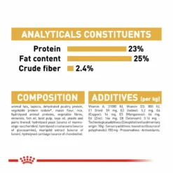 animal fats, tapioca, dehydrated poultry protein, vegetable protein isolate, maize flour, rice, hydrolysed animal proteins, vegetable fibres, minerals, fish oil, beet pulp, soya oil, yeasts and parts thereof, hydrolysed yeast (source of manno-oligo-saccharides), hydrolysed crustaceans (source of glucosamine), marigold extract (source of lutein), hydrolysed cartilage (source of chondroitin)