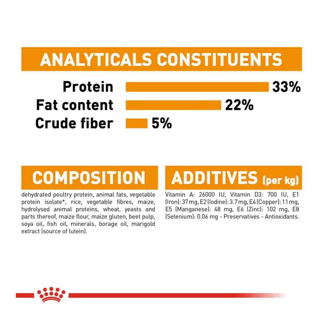 Dehydrated poultry protein, animal fats, vegetable protein isolate, rice, vegetable fibres, maize, hydrolysed animal proteins, wheat, yeasts and parts thereof, maize flour, maize gluten, beet pulp, soya oil, fish oil, minerals, borage oil, marigold extract (source of lutein)