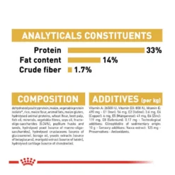 Protein (33%), Fat content (14%), Crude ash (7.3%), Crude fibres (1.7%)