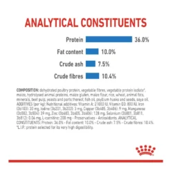 Crude ash (7.5%), Crude fibre (10.4%), Crude oil fats (10%), Protein (36%)