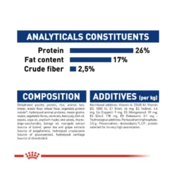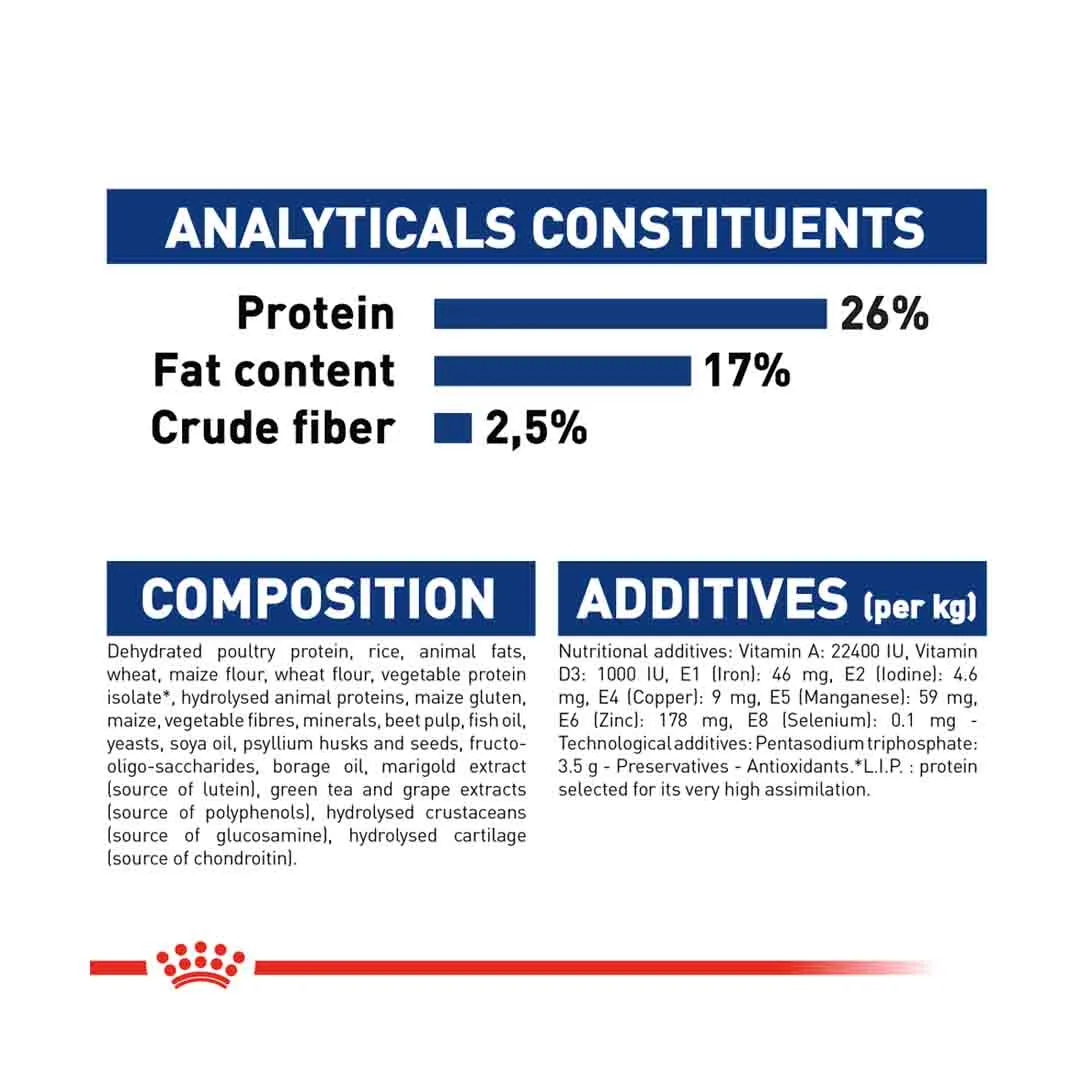 ehydrated poultry protein, rice, animal fats, wheat, wheat flour, maize flour, vegetable protein isolate, hydrolysed animal proteins, maize gluten, maize, vegetable fibres, beet pulp, fish oil, soya oil, yeasts and parts thereof, minerals, psyllium husks and seeds, fructo-oligo-saccharides, borage oil, marigold extract (source of lutein), hydrolysed crustaceans (source of glucosamine), hydrolysed cartilage (source of chondroitin)
