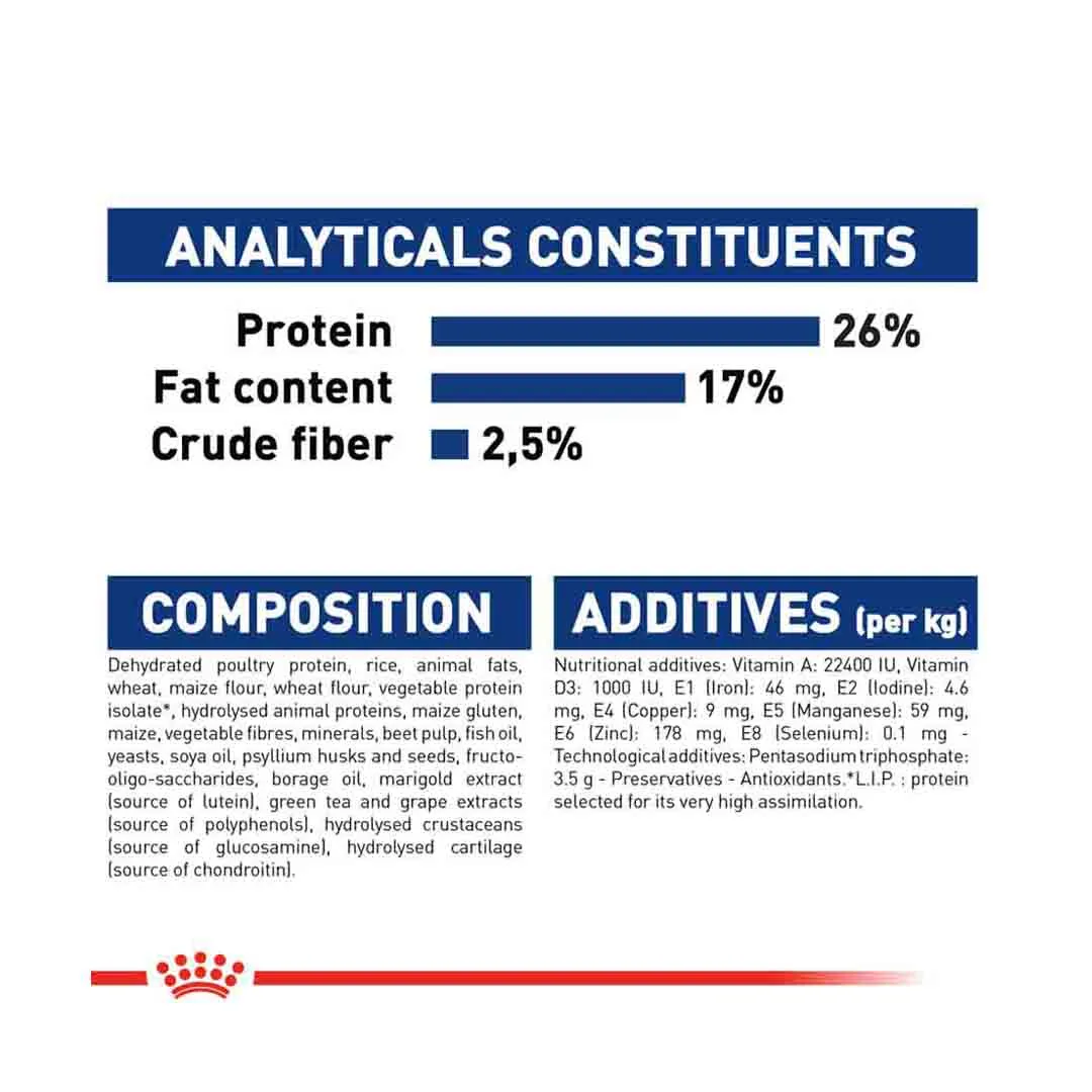 ehydrated poultry protein, rice, animal fats, wheat, wheat flour, maize flour, vegetable protein isolate, hydrolysed animal proteins, maize gluten, maize, vegetable fibres, beet pulp, fish oil, soya oil, yeasts and parts thereof, minerals, psyllium husks and seeds, fructo-oligo-saccharides, borage oil, marigold extract (source of lutein), hydrolysed crustaceans (source of glucosamine), hydrolysed cartilage (source of chondroitin)