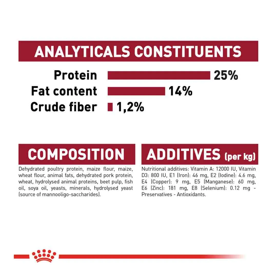 Dehydrated poultry protein, maize flour, maize, wheat flour, animal fats, wheat, hydrolysed animal proteins, beet pulp, fish oil, minerals, soya oil, yeasts and parts thereof, hydrolysed yeast (source of manno-oligosaccharides) (0.05%)