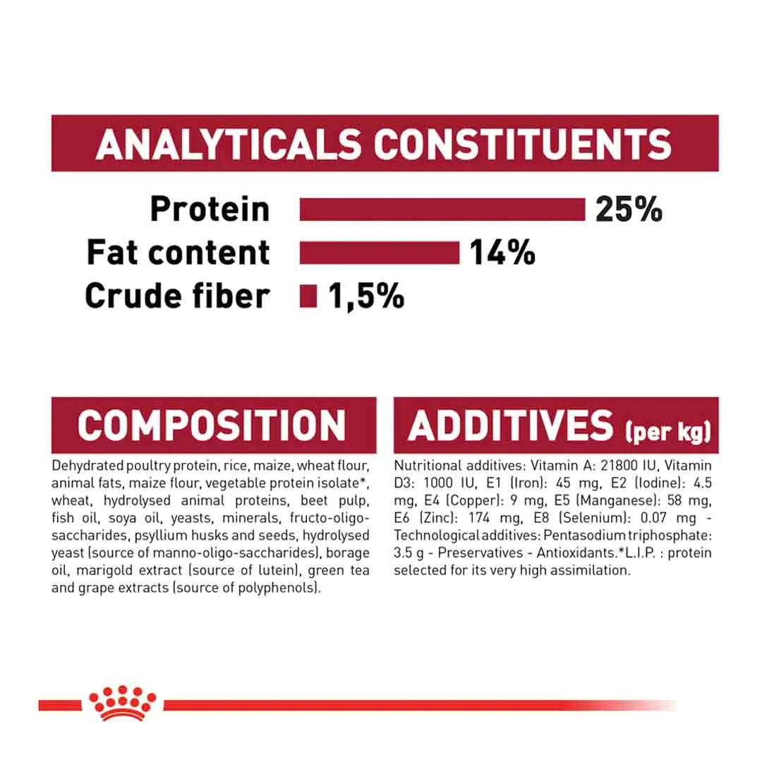 dehydrated poultry protein, rice, maize, wheat flour, animal fats, maize flour, vegetable protein isolate, wheat, hydrolysed animal proteins, beet pulp, fish oil, soya oil, yeasts, minerals, fructo-oligo-saccharides, psyllium husks and seeds, hydrolysed yeast (source of manno-oligo-saccharides), borage oil, marigold extract (source of lutein), green tea and grape extracts (source of polyphenols)