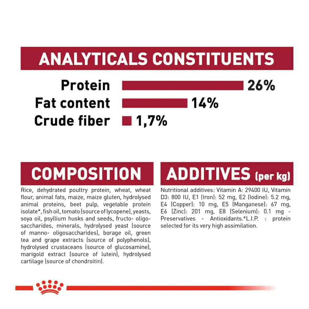 Rice, dried poultry protein, wheat, wheat feed meal, animal fat, maize, maize gluten meal, hydrolysed animal protein, dried beet pulp, vegetable protein isolate, fish oil, soya oil, yeast and its derivatives, tomato [source of lycopene], psyllium [husks and seeds], fructo-oligosaccharides, yeast hydrolysate [source of mannan-oligosaccharides], minerals, borage oil, crustaceans hydrolysate [source of glucosamine], marigold flower meal [source of lutein], cartilage hydrolysate [source of chondroitin]