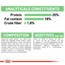 Rice, dehydrated poultry protein, wheat flour, animal fats, wheat, maize gluten, vegetable protein isolate, barley, hydrolysed animal proteins, beet pulp, soya oil, minerals, fish oil, vegetable fibres, fructo-oligo-saccharides, hydrolysed yeast (source of manno-oligo-saccharides), borage oil, marigold extract (source of lutein)