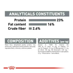 Maize flour, dehydrated poultry protein, rice, animal fats, hydrolysed animal proteins, beet pulp, vegetable fibres, minerals, cellulose powder