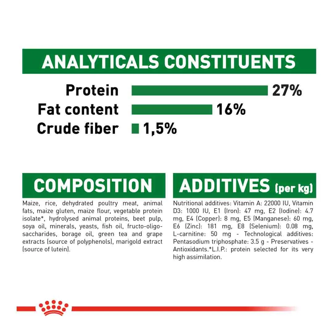 maize, rice, dehydrated poultry protein, animal fats, maize flour, maize gluten, vegetable protein isolate, hydrolysed animal proteins, beet pulp, soya oil, minerals, fish oil, yeasts and parts thereof, fructo-oligo-saccharides, borage oil, marigold extract (source of lutein)