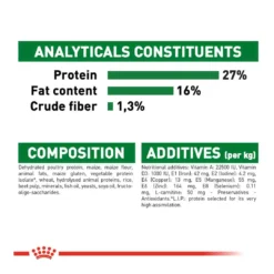 protein (27%), fat (16%), fibre (1.5%), ash (4.9%), omega-3 fats (0.67%), omega-6 fats (3.54%), taurine (0.21%), arginine (1.41%), L-lysine (1.15%),