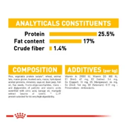 Rice, vegetable protein isolate, wheat, animal fats, maize gluten, husked oats, maize, hydrolysed animal proteins, minerals, soya oil, beet pulp, fish oil, flax seeds, fructo-oligo-saccharides, mono – and diglycerides of palmitic and stearic acids esterified with citric acid, borage oil, marigold extract (source of lutein)