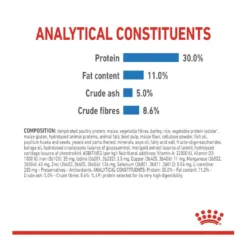 Dehydrated poultry protein, maize, vegetable fibres, barley, rice, vegetable protein isolate, maize gluten, hydrolysed animal proteins, animal fats, beet pulp, maize flour, cellulose powder, fish oil, psyllium husks and seeds, yeasts and parts thereof, minerals, soya oil, fatty acid salt, fructo-oligo-saccharides, borage oil, hydrolysed crustaceans (source of glucosamine), marigold extract (source of lutein), hydrolysed cartilage (source of chondroitin)