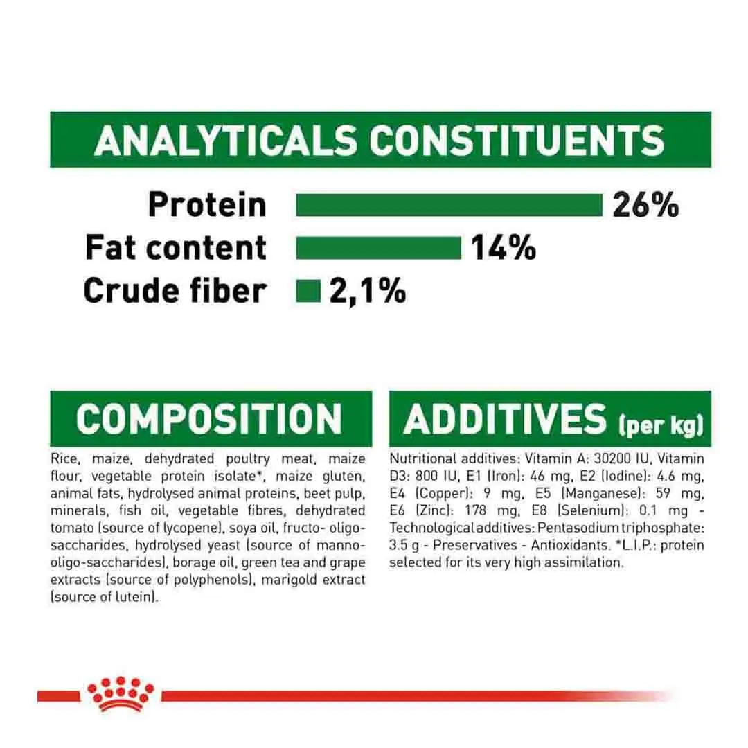 Rice, maize, dehydrated poultry protein, maize flour, vegetable protein isolate, maize gluten, animal fats, hydrolysed animal proteins, minerals, beet pulp, fish oil, vegetable fibres, tomato (source of lycopene), soya oil, fructooligo-saccharides, hydrolysed yeast (source of manno-oligo-saccharides), borage oil, marigold extract (source of lutein)