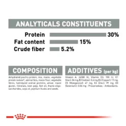 Crude ash (7%), Crude fibre (5.2%), Crude oil fats (15%), Moisture, Protein (30%)