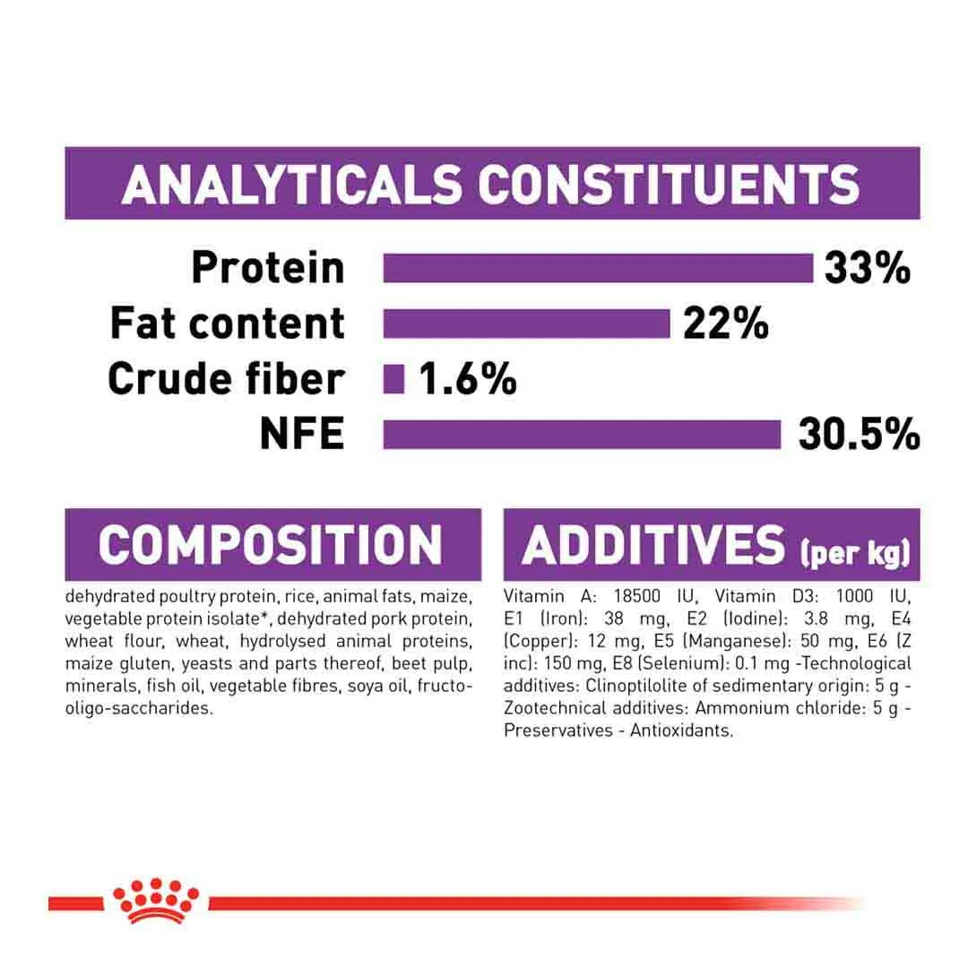 dehydrated poultry protein, rice, animal fats, maize, vegetable protein isolate, dehydrated pork protein, wheat flour, wheat, hydrolysed animal proteins, maize gluten, yeasts and parts thereof, beet pulp, minerals, fish oil, vegetable fibres, soya oil, fructo-oligo-saccharides