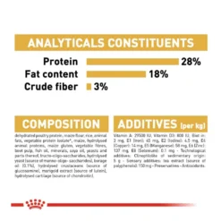 Dehydrated poultry protein, maize flour, rice, animal fats, maize, hydrolysed animal proteins, maize gluten, vegetable fibres, beet pulp, fish oil, minerals, soya oil, yeasts and parts thereof, fructooligo-saccharides, hydrolysed yeast (source of manno-oligo-saccharides), borage oil (0.1%), hydrolysed crustaceans (source of glucosamine), marigold extract (source of lutein), hydrolysed cartilage (source of chondroitin)