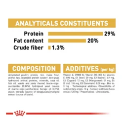 Poultry protein (dried), rice, maize meal, animal fat, vegetable protein isolate, dried sugar beet pulp, animal protein (hydrolysed), minerals, soya oil, fish oil, yeast and derivatives thereof, fructooligosaccharides (0.34%), yeast hydrolysate (source of mannanoligosaccharides), borage oil, yeast extract (source of beta-glucane), marigold meal (source of lutein)