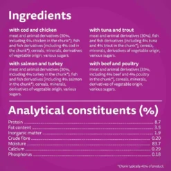Cod and Chicken Meat and Animal Derivatives (30%, including 4% Chicken in the Chunk), Fish and Fish Derivatives (including 4% Cod in the Chunk), Cereals, Minerals, Derivatives of Vegetable Origin, Various Sugars, Chunk typically (40%), Salmon and Turkey Meat and Animal Derivatives (30%, including 4% Turkey in the Chunk), Fish and Fish Derivatives (including 4% Salmon in the Chunk), Tuna and Trout Meat and Animal Derivatives (30%), Fish and Fish Derivatives (including 4% Tuna and 4% Trout in the Chunk), Beef and Poultry Meat and Animal Derivatives (33%, including 4% Beef and 4% Poultry in the Chunk)